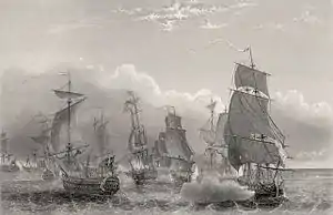 In order to cover the retreat of a convoy under Joseph de Flotte chased by the British, the lone 74-gun Annibal, under Lamotte-Picquet. For 90 minutes, Annibal single-handedly engaged the British squadron to block its advance, before she was joined by the two 64-guns, Vengeur and Réfléchi.[2] Ten to 11 of the transports were taken by the British or beached themselves to avoid capture, but the rest of the convoy of the escorting frigate Aurore managed to escape, and the division returned to its anchorage. Hyde Parker wrote Lamotte-Picquet a congratulation letter in the following days.[3]