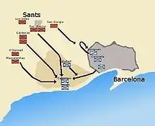 The Catalan rebels had taken up position on the heights of Montjuïc which dominated the city of Barcelona. The Spanish launched several concerted attempts to capture Montjuïc Castle, but were continually repulsed. Finally a large force of Catalan rebels counter-attacked from the direction of Barcelona. Large numbers of Spanish troops were killed and the remainder had to withdraw to Tarragona along the coast. The Spanish force had recently massacred hundreds of rebels who had tried to surrender at Cambrils.