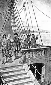 In 1690, Sir William Phips was appointed major-general by Massachusetts to command an expedition against French Acadia.[1] He sailed with seven vessels carrying a 450-strong provincial "Foot Regiment", and Port Royal surrendered on 21 May. Its governor, Louis-Alexandre des Friches de Menneval, had only about 70 men, and no guns mounted, and would have been unable to resist.[1] On 22 May, Phips recorded "We cut down the cross, rifled the Church, pulled down the High-Altar, breaking their images"; and on 23 May, "kept gathering Plunder both by land and water, and also under ground in their Gardens".[1]
