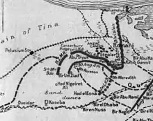 No major ground operations were carried out during these midsummer months, the Ottoman garrisons in the Sinai being scattered and out of reach of the British forces.[20] But constant patrolling and reconnaissance were carried out from Romani to Ogratina, to Bir el Abd and on 16 May to Bir Bayud, 19 miles (31 km) south-east of Romani, on 31 May to Bir Salmana 22 miles (35 km) east north-east of Romani by the New Zealand Mounted Rifle Brigade, when they covered 100 kilometres (62 mi) in 36 hours.[21][22] These patrols concentrated on an area of great strategic importance to large military formations wishing to move across the Sinai along the northern route. Here water was freely available in a large area of oases which extends from Dueidar, 15 miles (24 km) from Kantara on the Suez Canal, along the Darb es Sultani (the old caravan route), to Salmana 52 miles (84 km) away.[23]