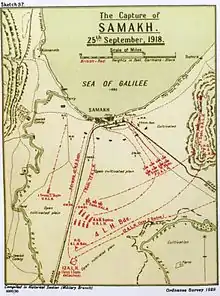 The Battle of Samakh was fought on 25 September 1918, during the Battle of Sharon which together with the Battle of Nablus formed the set piece Battle of Megiddo fought from 19 to 25 September 1918, in the last months of the Sinai and Palestine Campaign of the First World War. During the cavalry phase of the Battle of Sharon the Desert Mounted Corps commanded by the Australian Lieutenant General Harry Chauvel, captured the Esdraelon Plain (also known as the Jezreel Valley and the Plain of Armageddon) 40–50 miles (64–80 km) behind the front line in the Judean Hills on 20 September, when the 3rd Light Horse Brigade captured Jenin. The 4th Light Horse Brigade, Australian Mounted Division was deployed guarding supply columns, and prisoners, before being ordered to attack and capture Samakh on the shore of the Sea of Gallilee. Here the Ottoman and German garrison had been ordered by the commander of the Yildirim Army Group to fight to the last man.