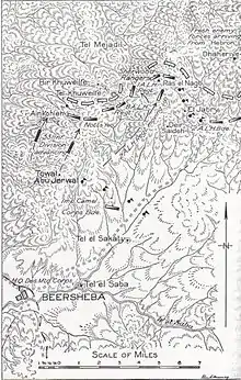Four Ottoman divisions fought in the area: the 19th, 24th and 27th Divisions, and the 3rd Cavalry Division.[29][30] During the battle on 31 October, the Ottoman III Corps headquarters had retreated from Beersheba to Tel es Sheria but, the next day (1 November), moved to support the defence of the Jerusalem road from Edh Dhahriye. They were followed by the 143rd Regiment (24th Division) and 1,500 rifles of the Beersheba Group, which had been reorganised at Tel es Sheria. This latter group moved to defend Tel el Khuweilfe.[31] On 1 November, the 125th Regiment (16th Division) also moved west into the hills coming under the command of the 27th Division, while the 6th Cavalry Regiment covered the Ottoman left flank to Yutta.[32] Kress von Kressenstein also sent the 19th Division to reinforce the Seventh Army in the area.[29] This strong Ottoman presence defending the area was designed to encourage Allenby to commit more units to the attack, to take the pressure off the Ottoman forces defending Gaza and Sharia, and to lessen the possibility of an EEF breakthrough.[33][Note 3]