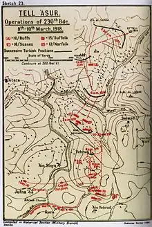 Infantry from the 74th (Yeomanry) Division's attack was made astride the Jerusalem to Nablus road; the 231st Brigade on the right moving towards Mezra ash Sherqiye a 1.5 miles (2.4 km) north north west of Tell 'Asur. But the difficult night advance was further complicated by the terrain and Ottoman machine guns and despite reinforcements being brought forward, the infantry were held up later in the day by the cavernous gorge of the Wadi el Jib.[9]