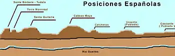 The battlefield was the area between Tudela and the neighbouring hills on the left. The Spanish front was deployed on the hills of Santa Barbara, Tudela, Torre Monreal, Santa Quiteria the top of Cabezoe Maya (the hill where the retreat of San Juan de Calchetas was), and the villages of Urzante (now disappeared), Murchante, and Cascante. Separating the Spanish and the French was the Queiles River, a tributary of the Ebro.