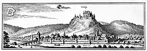 The Battle of Tuttlingen was fought in Tuttlingen on 24 November 1643. Involved in the conflict was on one side the French army in Germany led by Marshal Josias Rantzau, composed of French soldiers and the so called Weimarans or Bernhardines, German troops once in service of Bernard of Saxe-Weimar. Its contrahent was the army of the Holy Roman Empire led by Franz von Mercy. Technically, Mercy led a military force composed of his Bavarian army, supported by Imperial, Spanish, and Lorrainer troops.