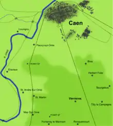 Verrières Ridge lies 8 km (5.0 mi) south of the city of Caen, overlooking broad plains and dominating the countryside between Caen and Falaise. Although a major D-Day objective for Commonwealth forces, the Allied push inland was halted short of Caen and positional warfare ensued until the first week of July.[5]