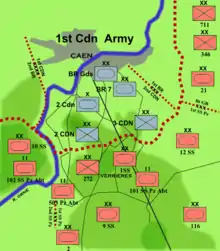 The onus of the task therefore fell on the fresh, though relatively inexperienced, Canadian 2nd Infantry Division, along with the tanks of the Canadian 2nd Armoured Brigade.[11][12] Additional forces were later made available in the shape of three divisions from the British I Corps: the 51st (Highland) Division, the Guards Armoured Division, and the British 7th Armoured Division.[13] Despite having significantly more combat experience than their Canadian counterparts, the British units played a minor part in the battle.[9][14][15]