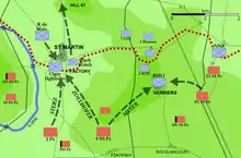 The central area of the ridge near Verrières Village was eventually taken and held by the Royal Hamilton Light Infantry.[27][34] The east side was also taken, but subsequently lost, although two British armoured brigades were able to secure significant footholds near the positions of the Royal Hamilton Light Infantry.[35]