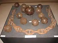 The Argentine general Lucio N. Mansilla set up three thick metal chains suspended from 24 boats completely across the river, to prevent the advance of the European fleet. This operation was under the charge of an Italian immigrant named Filipo Aliberti.[11] Only three of these boats were naval vessels; the rest were requisitioned barges whose owners received a compensation in case of loss.[12] Aliberti was the master of one of the boats, the Jacoba, sunk in the battle. At least 20 boats and barges were lost in the chain barrage at Obligado.