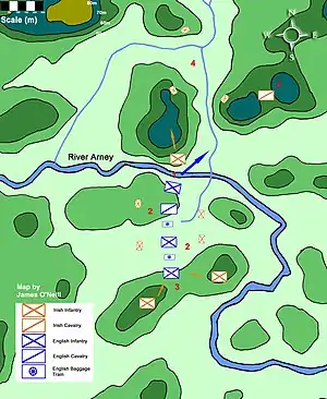 The English infantry included pikemen as well as musketeers and caliver-men (together known as "shot").[4] When the Irish surrounding Enniskillen learned of the relief force, they moved to intercept it with c.1,000 men, which included horsemen, kern, and caliver-men. On the evening of 6 August, the English force made camp three miles south of a ford on the Arney River. That night the English camp was harried by Irish gunfire and incessant skirmishing meant the English troops were poorly rested when they set out on 7 August to relieve the beleaguered garrison.[4]