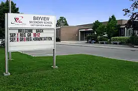 Bayview Secondary School is a grade 9–12, 2-semester secondary school operated by the York Region District School Board. It is located just north of the northeast corner of Bayview Avenue and Major Mackenzie Drive in Richmond Hill, Ontario, Canada.[2] Bayview S.S. was officially opened on March 10, 1960.