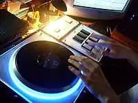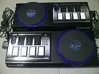 Konami also released home versions of IIDX for the PlayStation 2 console in Japan.[14] The home versions are known as CS (consumer software or console) styles, while the arcade versions are known as AC (arcade cabinet or arcade) styles. The CS games can be played with a DualShock controller or with a special controller from Konami that recreates the arcade experience. Konami manufactures two forms of home controllers, which are known as Konami Official Controllers (KOC) and Arcade Style Controllers (ASC). The KOC, pictured above, is much cheaper than the ASC, but is smaller than the ASC. In addition, KOCs look very different from ASCs and have a smaller space between the turntable and the keys. Konami purports the ASCs to be "arcade-accurate," in that they both resemble and feel like a controller on an arcade machine. For example, the controller itself is much larger and has the turntable further away from the keys. Both styles have a detachable key panel that can be placed to the left or the right of the turntable as the player desires. Aftermarket controllers are also readily available, often containing lit turntables and keys, as well as including microswitch based keys which are meant to closely mimic or be exactly like the ones used in the arcade.