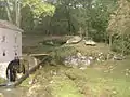 While exploring his property, Beck saw a waterfall coming out of a cave while hunting on the property. He quickly decided it would be a perfect place for a mill. This waterfall, which is actually a spring, is the second largest spring in Indiana.[7] The cave is a mile-long, and provides water throughout the year. The first mill was built in 1808, and was 11 ft x 11 ft stone and log structure. Beck built a small dam uphill west of the mill, which through gravity would create a low head of pressure for water to go through wooden troughs to turn the mill wheel, which was overshot. Some of the stones used for mill were buhr, and were brought to the site from Louisville, but originally from France,.[5][6] A second mill, built in 1825, was a frame building considerably larger than the first mill, which it replaced. Two carding]] machines was added in 1828.