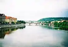 From 1862 Smetana was largely occupied with opera and, apart from a few short pieces,[129] did not return to purely orchestral music before beginning Má vlast in 1872. In his introduction to the Collected Edition Score, František Bartol brackets Má vlast with the opera Libuše as "direct symbols of [the] consummating national struggle".[130] Má vlast is the first of Smetana's mature large-scale works that is independent of words, and its musical ideas are bolder than anything he had tried before.[131] To musicologist John Clapham, the cycle presents "a cross-section of Czech history and legend and impressions of its scenery, and ... conveys vividly to us Smetana's view of the ethos and greatness of the nation."[132] Despite its nationalistic associations this work has, according to Newmarch, carried Smetana's name further afield than anything he wrote, with the exception of The Bartered Bride Overture.[133] Smetana dedicated Má vlast to the city of Prague; after its first performance in November 1882 it was acclaimed by the Czech musical public as the true representation of Czech national style.[124] Its Vltava (or "The Moldau" in German) movement, depicting the river that runs through Prague towards its junction with the Elbe, is Smetana's best-known and most internationally popular orchestral composition.[134]