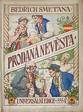 In July 1863, Sabina had delivered the libretto for a second opera, a light comedy entitled The Bartered Bride, which Smetana composed during the next three years. Because of the success of The Brandenburgers, the management of the Provisional Theatre readily agreed to stage the new opera, which was premiered on 30 May 1866 in its original two-act version with spoken dialogue.[58] The opera went through several revisions and restructures before reaching the definitive three-act form that in due course established Smetana's international reputation.[67][68] The opera's first performance was a failure; it was held on one of the hottest evenings of the year, on the eve of the Austro-Prussian War, with Bohemia under imminent threat of invasion by Prussian troops. Unsurprisingly the occasion was poorly attended, and receipts failed to cover costs.[69] When presented at the Provisional Theatre in its final form, in September 1870, it was a tremendous public success.[70]