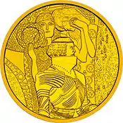 Because of the frieze's fame and popularity, it was made the main motif of a collectors' coin: the Austrian 100 euro Secession Coin, minted on November 10, 2004. The reverse side features a small portion of the frieze. The extract from the painting features three figures: a knight in armor representing "Armored Strength", one woman in the background symbolizing "Ambition" holding up a wreath of victory and a second woman representing "Sympathy" with lowered head and clasped hands.