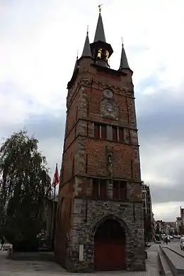 The belfry of Kortrijk, or Belfort in Dutch, is a medieval bell tower in the historical centre of Kortrijk, Belgium. One of the city's most prominent symbols, the belfry formerly housed a treasury and the municipal archives, and served as an observation post for spotting fires and other danger. A narrow, steep staircase, accessible by the public without any entry fee, leads to the top of the building, which nowadays leans about a bit to the west. The Belfry has been part of the UNESCO World Heritage since 1999.