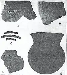 - Lake Winnebago Focus - 23 sherds were thought by the authors to be affiliated with this Oneota pottery type. These sherds were shell-tempered with smooth surfaces. Cultural affiliation is thought to be a Siouan-speaking group, possibly the Winnebago tribe.