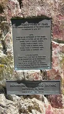 Beniamino "Benny" Bufano (October 15, 1890 – August 18, 1970) was an Italian American sculptor, best known for his large-scale monuments representing peace and his modernist work often featured smoothly rounded animals and relatively simple shapes. He worked in ceramics, stone, stainless steel, and mosaic, and sometimes combined two or more of these media and some of his works are cast stone replicas. He had a variety of names used, and sometimes went by the name Benvenuto Bufano because he admired Benvenuto Cellini. His youthful nickname was "Bene," which was often anglicized into "Benny." He had lived in Northern California for much of his career.