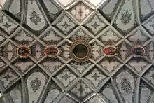 The central nave walls are supported by fourteen flying buttresses. Each buttress starts at a decorated column which rises above the roof of the side naves and side chapels. The buttresses rise at an angle of 43° 30’. The lower side of the buttresses are decorated with egg-shaped cut outs, with vesica piscis and spandrel designs.[3]