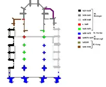 The Hostienmühle window was built between 1448–1453 and was funded by the city of Bern. The Three Kings window was built between 1447 and 1455 for Rudolf von Ringoltingen, possibly in Constance or the Oberrhein region. The Bible scenes window was originally supposed to be just of the young Christ, but was changed after 1447. It was built between 1448 and 1451 and was funded by three members of the Gesellschaft zum Mittellöwen. The Passion window was built between 1438 and 1441. Only 21 panels of the original window remain.[18] It was built for the city through the Schultheiß by Hans Acker in Ulm. The Ten thousand martyrs window was originally supposed to be of the Resurrection of Jesus, but that was changed after 1447. It was built between 1447 and 1449 and was funded by donations from the citizens of Bern. It was built by Master Painter Bernhart and glazier Niklaus Magerfritz in Bern. The Ten thousand martyrs window was replaced in 1868 by the Christ window. The Stephanus window replaced an earlier window in 1868. The theme of the original window is unknown but it was built in 1449–1451 for Kaspar von Scharnachtal, probably by Niklaus Magerfritz in Bern. The Coat of Arms window was built in 1820–30 to replace an earlier, unknown window.[19]