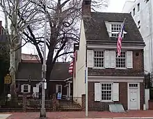 The Betsy Ross House is a landmark in Philadelphia purported to be the site where the seamstress and flag-maker Betsy Ross (1752-1836) lived when she is said to have sewed the first American Flag. The origins of the Betsy Ross myth trace back to her relatives, particularly her grandsons, William and George Canby, and the celebrations of the Centennial of 1876.[1] Evidence for the precise location of Ross' home came from verification provided by several surviving family members,[2] although the best archival evidence indicates the house would have been adjacent to the one that still stands today as The Betsy Ross House.[3] Although the house is one of the most visited tourist sites in Philadelphia,[4] the claim that Ross once lived there, and that she designed and sewed the first American flag, sometimes called the Betsy Ross flag, are considered false by most historians.[5][6]