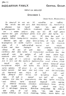 The language commonly spoken by Bhils throughout their geographic distribution is Bhili.[13] Bhili has about up to 36 identified dialects and pronunciation differs by region.[13][14] Bhili is based on Gujarati, but dialects of Bhili gradually merge into more widely spoken languages such as Marathi in the southeast and Rajasthani in the northwest. Around 10 million people recorded themselves as speaking a Bhili dialect in the census.[15]