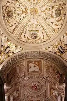 The staircase consists of four domes (the Dome of Ethics, the Dome of Rhetoric, the Dome of Dialectic, and the Dome of Poetics) and two flights, the vaults of which are each decorated with twenty-one images of alternating quadrilinear stuccoes by Alessandro Vittoria and octagonal frescoes by Battista Franco (first flight) and Battista del Moro (second flight).[121][122][123] At the entry and on the landings, Sansovino repeated the Serlian element from the façade, making use of ancient columns taken from the dilapidated sixth-century Byzantine Church of Santa Maria del Canneto in Pola on the Istrian peninsula.[124][125]