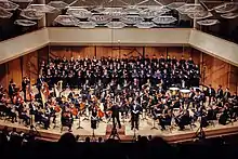 - Mary B. Galvin Recital Hall. This 400-seat hall, with main floor and balcony seating, features a 40-foot glass wall offering views of Lake Michigan and the Chicago skyline. Walls on each side of the hall are made from undulating Forest Stewardship Council-certified wood, covered by African moabi wood, providing optimal acoustics. The hall is equipped with state-of-the-art sound and video equipment for optimal recording. John van Rein of the Chicago Tribune named Galvin Hall the "most impressive new Chicago concert facility" in 2015.[12]