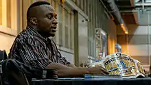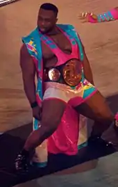 Big E entered the 2019 Royal Rumble, but was eliminated by Samoa Joe.[91] In the lead-up to WrestleMania 35, Big E's New Day teammate Kofi Kingston was attempting to earn a shot at the WWE Championship and after many attempts, WWE Chairman Vince McMahon granted him the title shot after Big E and Xavier Woods defeated Luke Gallows and Karl Anderson, Shinsuke Nakamura and Rusev, The Bar, The Usos, and Daniel Bryan and Erick Rowan in a tag-team gauntlet match.[92] Shortly after WrestleMania, Big E suffered a legitimate knee injury which sidelined him for weeks.[93] He later returned and eventually earned another SmackDown tag team title opportunity at Extreme Rules. At the event, Big E and Xavier Woods defeated Daniel Bryan and Erick Rowan and Heavy Machinery to win the titles (during this reign, Kingston was not recognized as champion as he was the reigning WWE Champion).[94] They lost the titles to The Revival at Clash of Champions,[95] but regained it on the November 8 episode of SmackDown, becoming record five-time champions as a team, and a record fifth reign for Big E individually (Woods is not recognized for this reign due to an injury).[96] At TLC: Tables, Ladders & Chairs, Big E and Kingston successfully defended the titles against The Revival in a ladder match.[97] On January 26, 2020, at the Royal Rumble, Big E participated in the Royal Rumble match, but was eliminated by Brock Lesnar.[98]