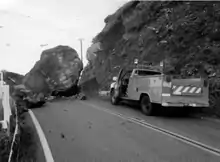 In 1998, about 40 different locations on the road were damaged by El Niño storms, including a major slide 2 miles (3.2 km) south of Gorda that closed the road for almost three months.[36] The Associated Press described the damage as "the most extensive destruction in the 60-year history of the world famous scenic route".[58]