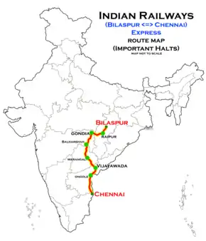 The Bilaspur–Chennai Central Superfast Express is a Superfast Express train belonging to South East Central Railway zone that runs between Bilaspur Junction and Chennai Central in India. It is currently being operated with 12851/12852 train numbers on a weekly basis.[1][2][3]