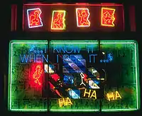 Didy Wah Didy is named for the last stop on a mythical railroad bound for hell (Black Southern American folklore.) With simple imagery and few words the piece is a timed neon sequence that shows a mushroom cloud forming (animated) over a boy's head. With the words "Atomic Playground Ahead" and "Kids Ride the Big One!" it is a piercing send-up of typical American roadside attractions. In three of the four corners, constantly flashing are the words "chills," "spills" and "thrills." When the "kid", who starts out smiling, then becomes alarmed, is finally "nuked," "death" with an alternating skull and crossbones flashes in the lower right hand corner. The three flashing words are surrounded by the icons common in Lawless' work, thunderbolts, dollar signs and stars. The display takes about 60 seconds to complete its sequence.