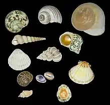 The mollusc shell is a biogenic composite material that has been the subject of much interest in materials science because of its unusual properties and its model character for biomineralization. Molluscan shells consist of 95–99% calcium carbonate by weight, while an organic component makes up the remaining 1–5%. The resulting composite has a fracture toughness ≈3000 times greater than that of the crystals themselves.[15] In the biomineralization of the mollusc shell, specialized proteins are responsible for directing crystal nucleation, phase, morphology, and growths dynamics and ultimately give the shell its remarkable mechanical strength. The application of biomimetic principles elucidated from mollusc shell assembly and structure may help in fabricating new composite materials with enhanced optical, electronic, or structural properties. The most described arrangement in mollusc shells is the nacre - prismatic shells, known in large shells as Pinna or the pearl oyster (Pinctada). Not only the structure of the layers differ, but their mineralogy and chemical composition also differ. Both contain organic components (proteins, sugars and lipids) and the organic components are characteristic of the layer, and of the species.[5] The structures and arrangements of mollusc shells are diverse, but they share some features: the main part of the shell is a crystalline Ca carbonate (aragonite, calcite), despite some amorphous Ca carbonate occurs; and despite they react as crystals, they never show angles and facets.[16] The examination of the inner structure of the prismatic units, nacreous tablets, foliated laths... shows irregular rounded granules.