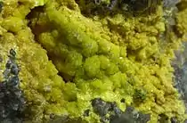 Furthermore, biomineralization —also known as bioprecipitation— is the precipitation of radionuclides through the generation of microbial ligands, resulting in the formation of stable biogenic minerals. These minerals have a very important role in the retention of radioactive contaminants. A very localized and produced enzymatically ligand concentration is involved and provides a nucleation site for the onset of biomineral precipitation.[27] This is particularly relevant in precipitations of phosphatase activity-derivate biominerals, which cleavage molecules such as glycerol phosphate on periplasm. In Citrobacter and Serratia genera, this cleavage liberates inorganic phosphates (HPO42−) that precipitates with uranyl ion (UO22+) and cause deposition of polycrystalline minerals around the cell wall.[2][28] Serratia also form biofilms that promote precipitation of chernikovite (rich in uranium) and additionally, remove up to 85% of cobalt-60 and 97% of cesium-137 by proton substitution of this mineral.[25] In general, biomineralization is a process in which the cells do not have limitations of saturation and can accumulate up to several times its own weight as precipitated radionuclides.[4]