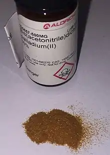 Bis(acetonitrile)palladium dichloride is the coordination complex with the formula PdCl2(NCCH3)2. It is the adduct of two acetonitrile ligands with palladium(II) chloride. It is a yellow-brown solid that is soluble in organic solvents. The compound is a reagent and a catalyst for reactions that require soluble Pd(II).[1] The compound is similar to bis(benzonitrile)palladium dichloride. It reacts with 1,5-cod to give dichloro(1,5‐cyclooctadiene)palladium.