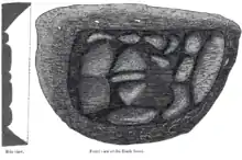It is an irregular oval, about seven inches [18 cm] in diameter, with an undulated surface, composed of about a dozen smaller stones of different sizes and shapes, well joined together with a small quantity of cement, and perfectly well smoothed; it looks as if the whole had been broken into as many pieces by a violent blow, and then united again. It is very difficult to determine accurately the quality of this stone which has been worn to its present surface by the millions of touches and kisses it has received. It appeared to me like a lava, containing several small extraneous particles of a whitish and of a yellow substance. Its colour is now a deep reddish brown approaching to black. It is surrounded on all sides by a border composed of a substance which I took to be a close cement of pitch and gravel of a similar, but not quite the same, brownish colour. This border serves to support its detached pieces; it is two or three inches in breadth, and rises a little above the surface of the stone. Both the border and the stone itself are encircled by a silver band, broader below than above, and on the two sides, with a considerable swelling below, as if a part of the stone were hidden under it. The lower part of the border is studded with silver nails.[12]