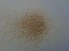 Pepper gets its spicy heat mostly from piperine derived from both the outer fruit and the seed. Black pepper contains between 4.6 and 9.7% piperine by mass, and white pepper slightly more than that.[49] Refined piperine, by weight, is about one percent as hot as the capsaicin found in chili peppers.[50] The outer fruit layer, left on black pepper, also contains aroma-contributing terpenes, including germacrene (11%), limonene (10%), pinene (10%), alpha-phellandrene (9%), and beta-caryophyllene (7%),[51] which give citrusy, woody, and floral notes. These scents are mostly missing in white pepper, as the fermentation and other processing removes the fruit layer (which also contains some of the spicy piperine). Other flavours also commonly develop in this process, some of which are described as off-flavours when in excess: Primarily 3-methylindole (pig manure-like), 4-methylphenol (horse manure), 3-methylphenol (phenolic), and butyric acid (cheese).[52] The aroma of pepper is attributed to rotundone (3,4,5,6,7,8-Hexahydro-3α,8α-dimethyl-5α-(1-methylethenyl)azulene-1(2H)-one), a sesquiterpene originally discovered in the tubers of Cyperus rotundus, which can be detected in concentrations of 0.4 nanograms/l in water and in wine: rotundone is also present in marjoram, oregano, rosemary, basil, thyme, and geranium, as well as in some Shiraz wines.[53]