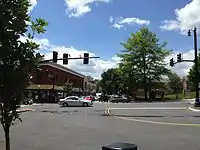 The amount of commercialization in the area began to increase in the mid-1960s. The Corning Glass Works (now called Corning Incorporated), based in upper New York State, opened a manufacturing facility in 1964 that is located south of Blacksburg. The Blacksburg Municipal Building on South Main Street was constructed in 1969.[20] Terrace View apartments, the first large student complex, was built in 1970. The Blacksburg Branch of the Montgomery County Library was opened the same year. Ten years later, it was moved into the facility that used to house the Blacksburg Lumber Company on Draper Road. In 1971, Blacksburg ratified a new charter and LewisGale Hospital Montgomery was built. The University Mall shopping center opened that year as well. In the mid 1970s the Foxridge apartments, an even larger student apartment complex, was built as part of the Hethwood development. During 1981, the Blacksburg Community Center opened. It cost the town $1.2 million to build.[20] By 1988, the New River Valley Mall, located in the neighboring town of Christiansburg, was opened[24] and the Virginia Tech Corporate Research Center had its first ground-breaking ceremony.[22]