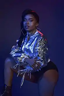 While in the UK, she met a Cameroonian artist who hooked her up with her first studio session. Back then the artist went by stage name ‘Swagger Queen’. By 2015, she released her first single ‘Killa’ produced by Ayo Beats.[6] She later got in contact with Cameroonian-based music producer Mr. Elad who wrote her first official single ‘Kam we stay’ in 2016 produced by Cameroonian-based producer Philbillbeatz. After dropping the single, Blanche decided it was time to move back to her motherland and connect more with the industry she was trying to build a career from. With the success of ‘Kam we stay’, Blanche again in 2017 collaborated with Philbillbeatz on another single she wrote titled ‘Mimbayeur’ which features rapper Minks. With more success on the single which blew up YouTube with over 5million views, Blanche Bailly became a house hold name in the Central African Music scene. She later dropped more hits like; ‘Dinguo, Bonbon and most recently ‘Ndolo’ and ‘Ton pied, mon pied’ and her latest Hit ‘Argent’. Blanche has performed in sold-out shows within Cameroon and countries like Gabon, Malabo, France, Geneva and in 2018 did a successful Europe club tour. Blanche Bailly's talent and hard work has been rewarded with nominations for Best Female Central African Artist at the AFRIMA, Best Urban and Revelation of the year at Canal D’or[7] and winning Revelation of the year at Balafon Music Awards in 2016.[8][9]