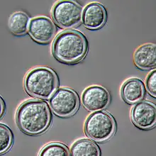 In nature, the fungus forms a network of thread-like mycelium that penetrates the substratum on which it grows, and then after 3–5 days of growth begins to reproduce asexually with small (2–10 µm) conidia (asexual spores). These conidia are probably the main infectious particles produced by the fungus. They form on individual short stalks and readily become airborne when the colony is disturbed; their size places them well within the respirable size range for particles,[5] meaning that they can deposit deeply in the lungs when inhaled. Sexual reproduction by the fungus requires the meeting of colonies of + and – mating type, probably a relatively rare event, and results in the production of small ascomata (sexual fruiting bodies) 200–350 µm, looking, to the naked eye, similar to a woollen fuzz ball, and in microscopic view consisting of a layer of spiralling, springy guard hairs surrounding a fertile core in which groups of 8 ascospores (sexual spores) are produced in small round reproductive sacs (asci). The ascospores, at 1.5–2.0 µm, are among the smallest reproductive particles produced by fungi, and are within the respirable size range.[5] The budding yeast cells seen in infected tissues and bodily fluids are generally relatively large (c. 8–15 µm) and characteristically bud through a broad base or neck, making them highly recognizable to the pathologist. A small ("nanic") form is rarely seen with cells under 6 µm.