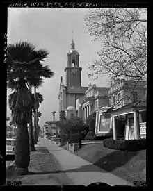 When the parish needed funds to build a new church in the 1920s, the movie industry, which often used the church as a shooting location, again offered its help. The movie studios including Universal and Keystone helped the parish raise funds for the new church, providing actors and equipment for the church's fundraising events.[5] In October 1926, the Los Angeles Times reported that Blessed Sacrament was holding the "biggest bazaar ever held in cinema town, with the co-operation of practically the entire motion-picture industry" to raise funds for the new church.[22] The Times noted that the bazaar was housed under a canvas top, "with gaily decorated booths, gorgeous articles donated by the motion-picture stars, and by wealth persons engaged in other industries."[22]