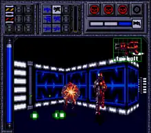The player's default weapon is a simple pulse reserve gun. Players can find one of ten special weapons scattered around the level. Each special weapon has a limited amount of ammo, and the player must obtain a new weapon to refresh the ammo;[1]:9 however, collecting a special ammo pickup will replenish the ammo for all of the weapons.[5] The player cannot use the reserve gun if they have any special weapons.[1]:9 Areas in each level are separated by sliding doors, in which players can open unconditionally; some of the doors are locked, and players must find and use the passkeys to unlock them.[1]:8 The game features the on-screen map to help players navigate the level.[5] The health is represented by an oxygen supply, which depletes whenever a hit from enemy fire or a mine is taken. A life is lost when the player's oxygen is emptied. Players start the game with three lives; the game is over when all the lives are exhausted. Extra oxygen and lives can be found throughout the maze.[1]:7