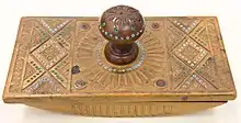 Drugs active in microgram range, most notably LSD, are commonly distributed on blotting paper. A liquid solution of the drug is applied to the blotting paper, which commonly is perforated into individual doses and artfully decorated with what is known as blotter art. Vanity blotter is blotter art that hasn't been exposed to LSD and is usually sold as a collectible, although inevitably much of this art ends up in illegal distribution. The artwork is printed onto blotter paper and then sometimes perforated into tiny squares or "tabs" which can be torn or cut apart.[3] Most blotter art designs have grid lines as part of the design to either aid in perforation or to be left as a cutting grid. Blotter as a delivery method allows for easy dosing of potent substances and easy sublingual administration of drugs which has made it increasingly popular as a preparation for other potent drugs including 25I-NBOMe and alprazolam.[4]