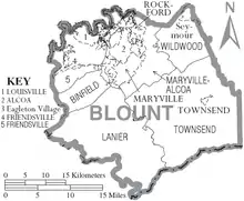 Blount County is a county located in the U.S. state of Tennessee. As of the 2010 census, the population was 123,010.[2] It had an estimated population of 133,088 in 2019.[3] The county seat is Maryville,[4] which is also the county's largest city.