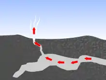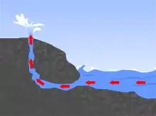 In geology, a blowhole or marine geyser is formed as sea caves grow landwards and upwards into vertical shafts and expose themselves towards the surface, which can result in hydraulic compression of sea water that is released through a port from the top of the blowhole.[1] The geometry of the cave and blowhole along with tide levels and swell conditions determine the height of the spray.[2][3]