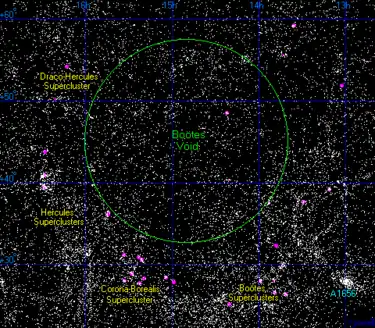 The Boötes void (or the Great Nothing)[1] is an enormous, approximately spherical region of space, containing very few galaxies. It is located in the vicinity of the constellation Boötes, hence its name. Its center is located at approximately right ascension14h 50m and declination 46°.[2]