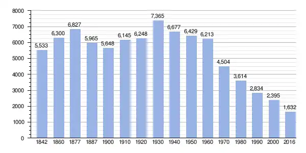 During the first decades of the 19th century the municipality of Boal kept a slow increase of population that was noticeably accelerated with the construction of the dam of Doiras in 1930, reaching in that year its historical maximum of 7,365 inhabitants. The relatively high levels of population remained until 1960, not just because of the dam but also because of the tungsten mining near Penouta and because of the existence of a traditional agriculture requiring a lot of labor. Thanks to all these factors, the municipality of Boal could be once the most populous one in the middle course of the Navia River. Nevertheless, from 1960 on and due to the closing of mines and to the changes experienced by the traditional agriculture, a very important migratory flow started.