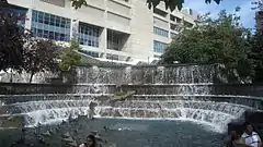 Located along the south end facing Bremner Avenue, there is a piece of artwork by artist Susan Schelle called Salmon Run. The sculpture is a representation of salmon leaping up a waterfall. The water fountain piece was not functional for many years, until it was restored in 2006.[1]