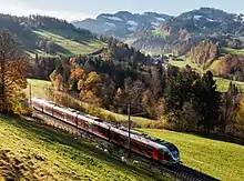 The Bodensee–Toggenburg railway is a mainly single-track standard-gauge line connecting Romanshorn on Lake Constance (Bodensee in German) and the Toggenburg region in Eastern Switzerland. It was built by the Bodensee-Toggenburg-Bahn (BT), a former railway company, which existed from 1910 until its merger with the "old" Südostbahn (SOB) to form the "new" Südostbahn (SOB) on 1 January 2001. Today, the line together with the Wattwil–Ebnat-Kappel section forms the eastern network of the Südostbahn.